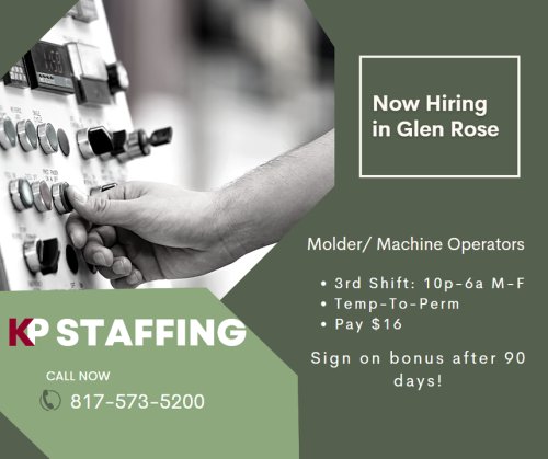 We are hiring for a variety of positions for a large plastic company in the Weatherford area! Come s...