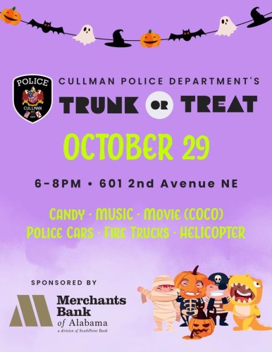 Mark your calendars and join us Tuesday , October 28th, from 6–8 PM at the Cullman Police Department for a fun, safe night of trick-or-treating with our officers and Merchants Bank of Alabama, a division of SouthPoint Bank.