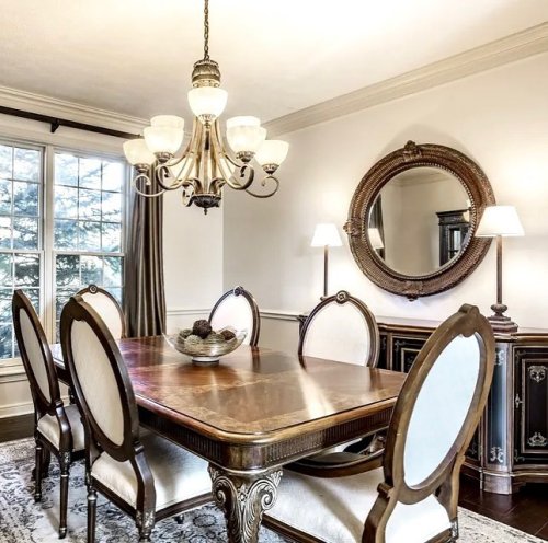 Century Furniture Casa Bella X Base 64” Round Dining Table ~ $1600 ••• Set of 6 White Leather Studded Amsterdam Dining Chairs by Suzanne Kasler for Hickory Chai...
