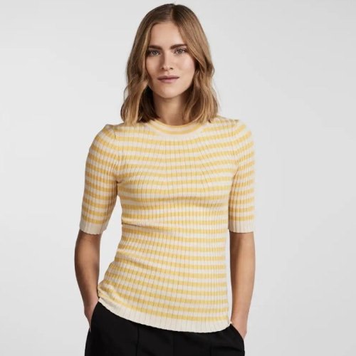 Wauw se lige denne fine strikkede t-shirt. Den har gule og hvide striber og er utrolig blød. Så fin her på de lune vinterdage og til foråret. 💛