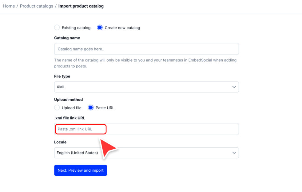 - En EmbedSocial, pega eso Url de alimentación xml para importar su catálogo
