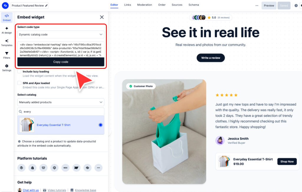 Con la EmbedSocial: UGC comprable puedes recopilar UGC de fuentes conectadas, organizarlo y etiquetar productos de Shopify para que cada widget se convierta en una ruta de conversión. Te ayuda a llevar a los compradores de la inspiración a la compra utilizando fotos, vídeos y opiniones de clientes reales en una sola experiencia.